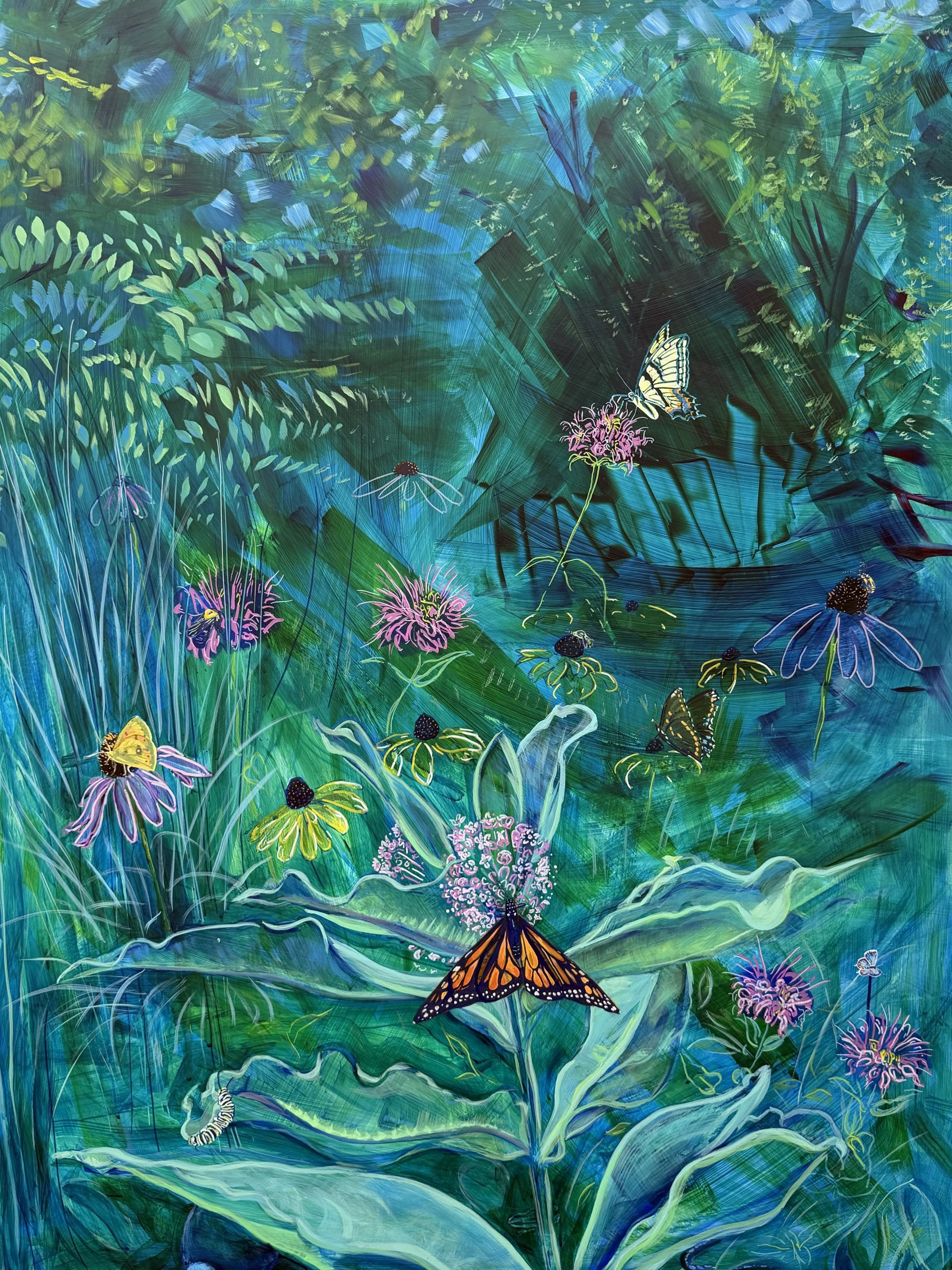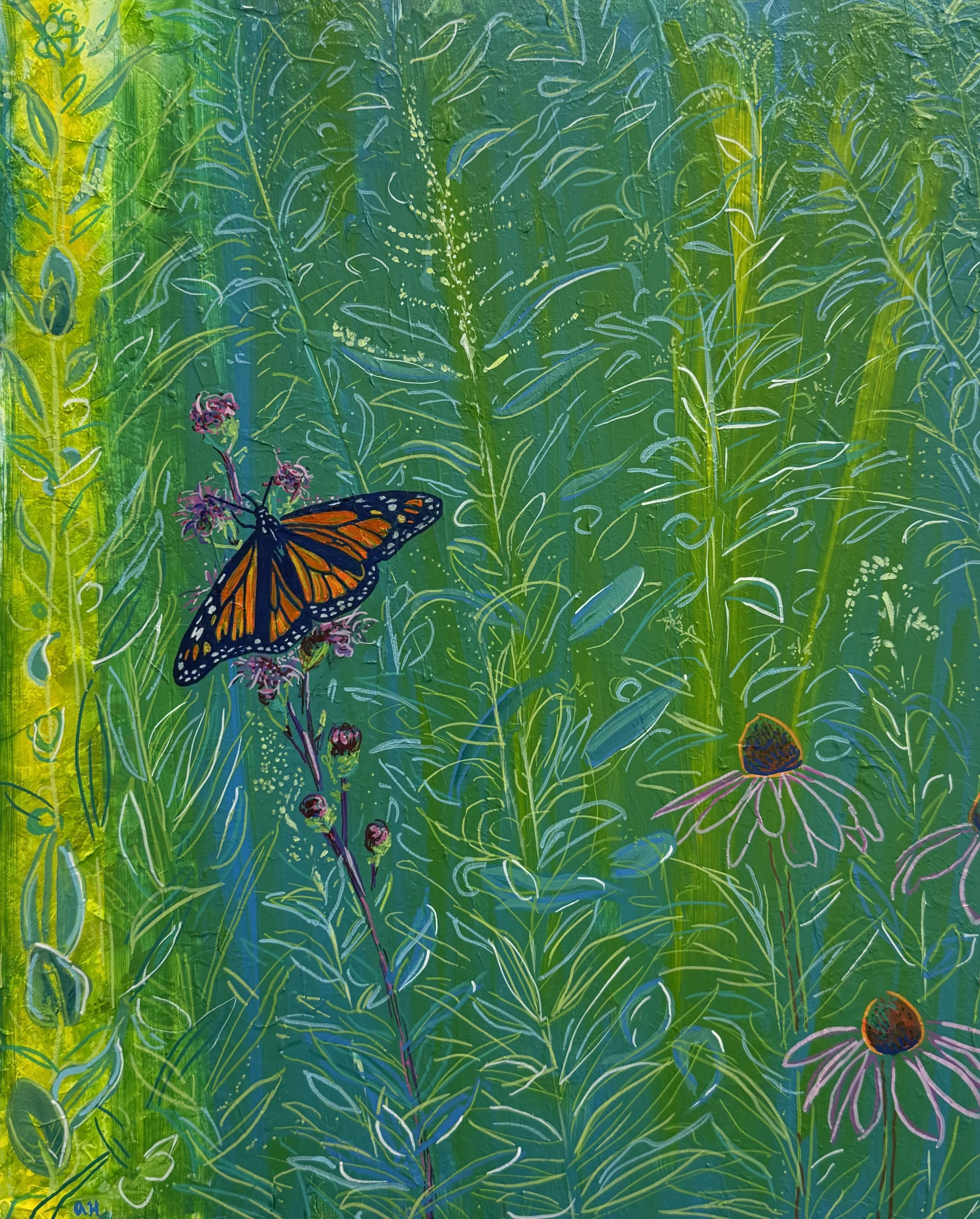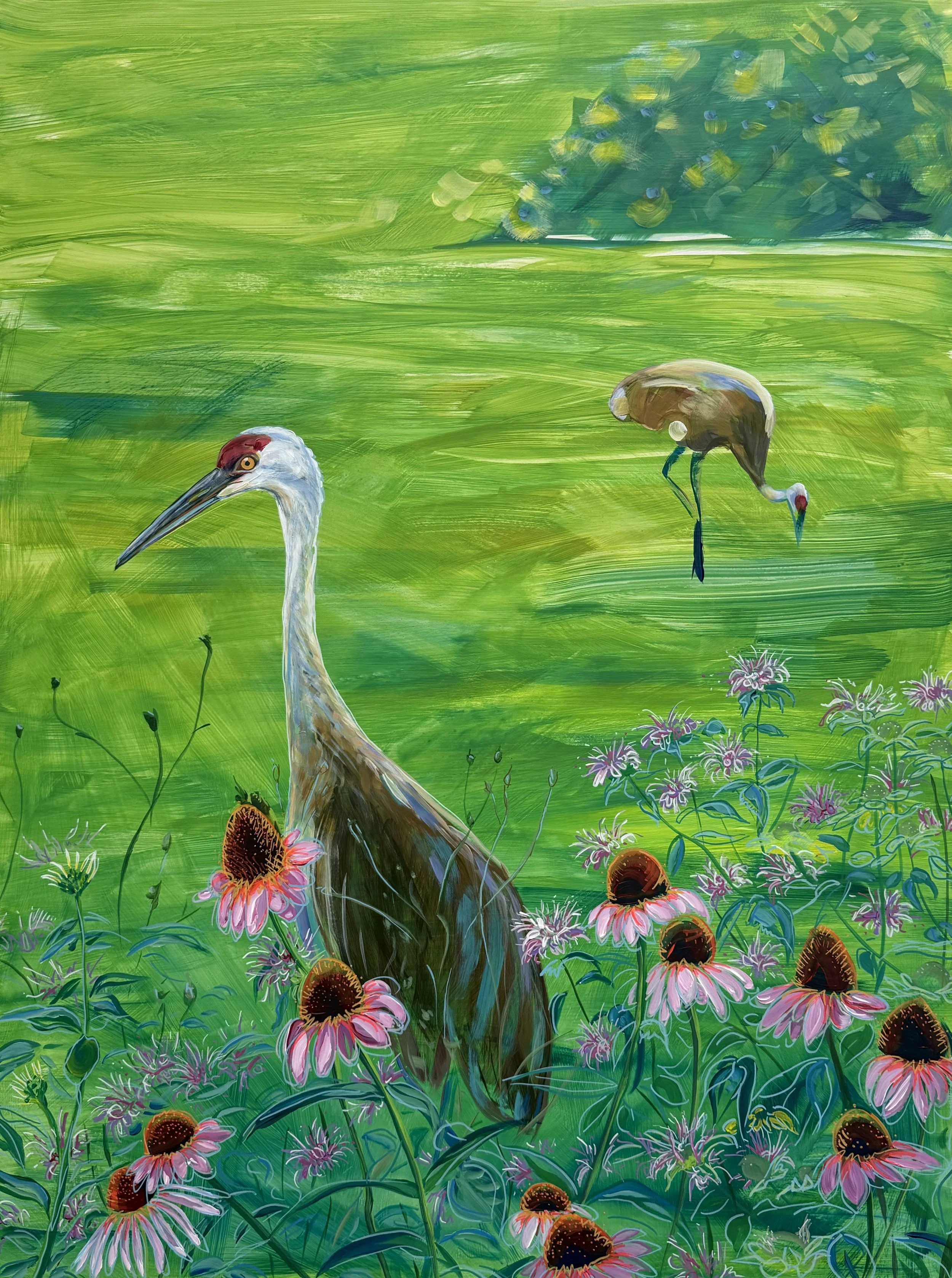 Each painting is inspired by migratory species that have come through my yard and a nearby newly restored wetland. It chronicles sandhill cranes and the wetlands, hummingbirds and the woodland, and monarchs and the prairie as they successfully find mates in their summer home—my home.