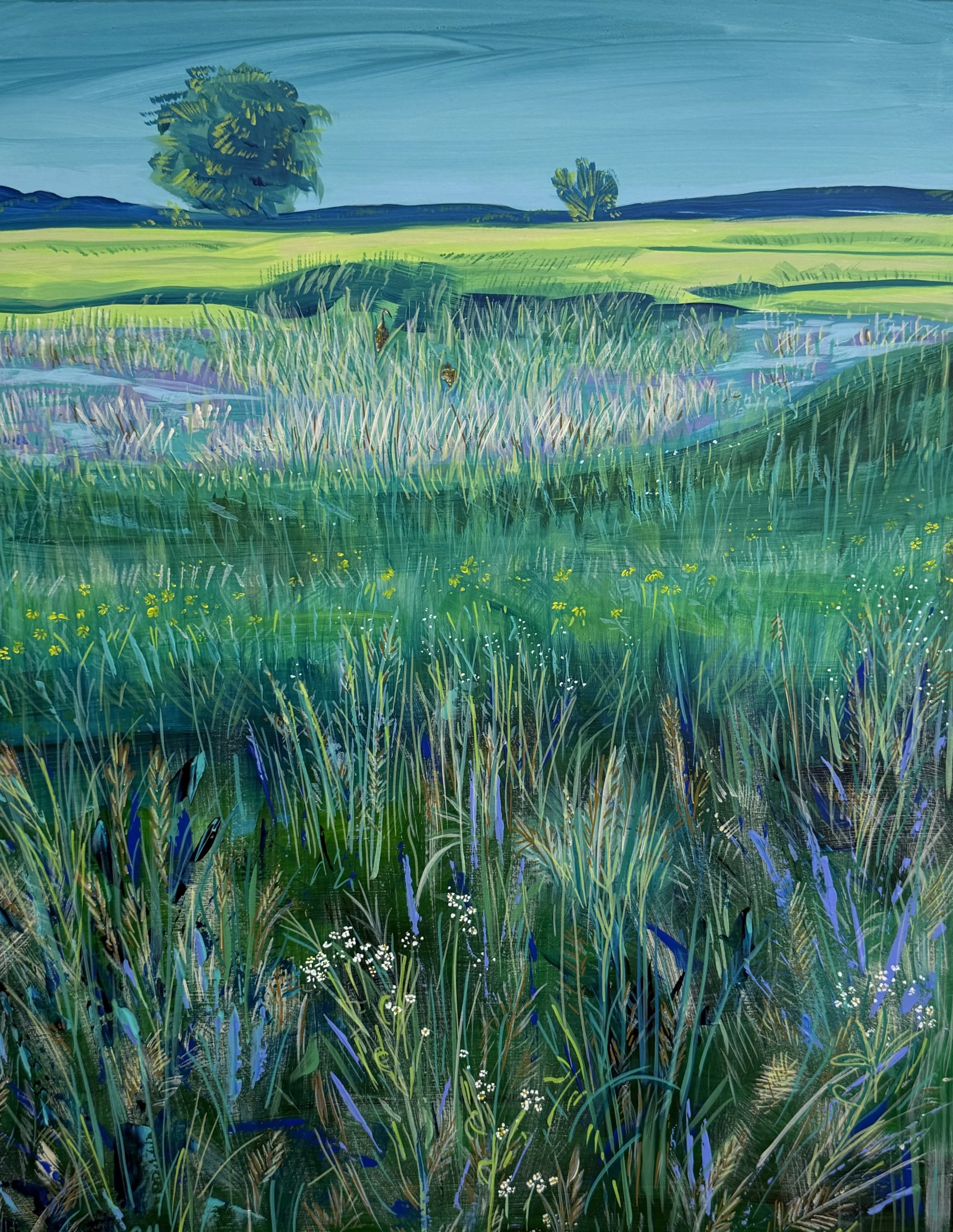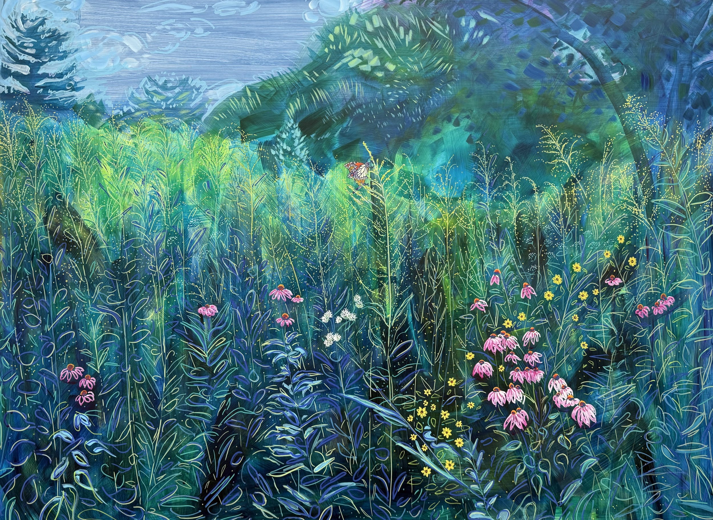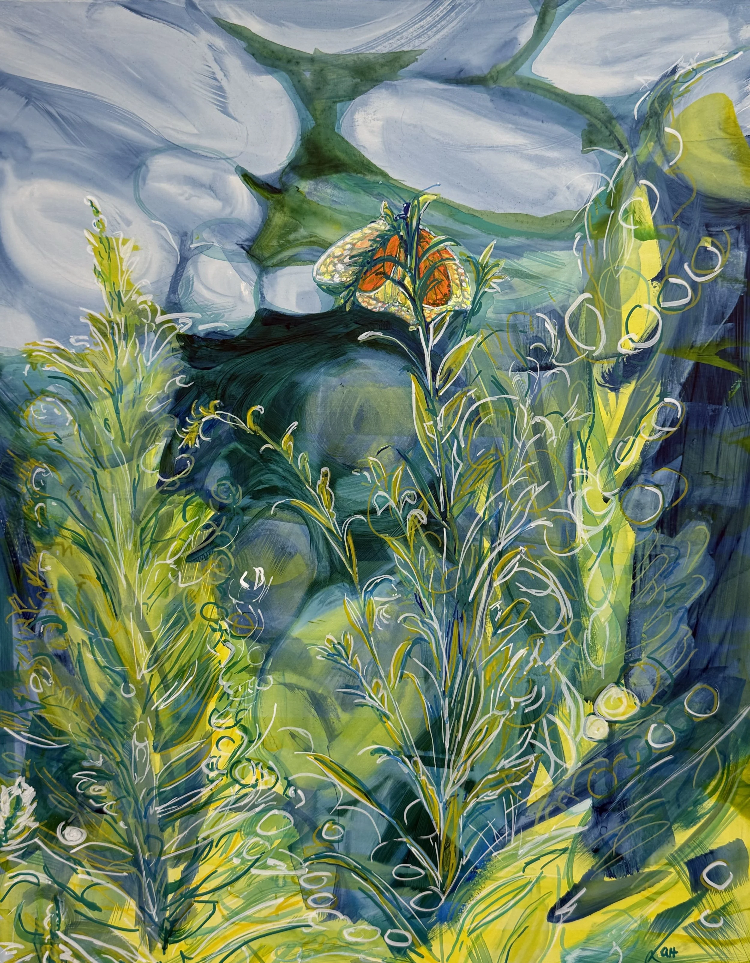 Each painting is inspired by migratory species that have come through my yard and a nearby newly restored wetland. It chronicles sandhill cranes and the wetlands, hummingbirds and the woodland, and monarchs and the prairie as they successfully find mates in their summer home—my home.